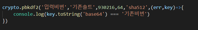 pbkdf2 (비번, 소금, 해쉬화반복횟수, 비번길이, 해쉬알고리즘, 콜백함수)