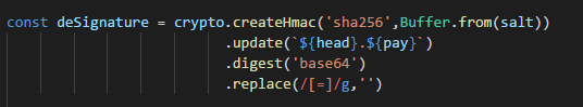 crypto.createHmac('alg방식', 소금).update(암호화할'header.payload').digest('인코딩방식').replace(=없애주기)