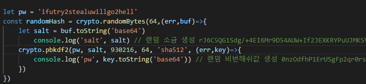 이 때, salt와 key를 무조건 같이 저장해야한다. 왜냐하면, 랜덤으로 계속해서 소금값도 달라지고, 그에 따라 암호화 결과도 매번 달라지기 때문이다. 당연하지만 반복횟수, 비번길이, 해쉬 알고리즘, 인코딩 방식까지 다 같아야 같은 결과가 나오니 주의할 것