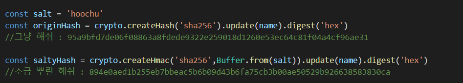 보통 이 salt는 .env파일에 넣거나 랜덤 문자열로 생성해서 비번과 같이 DB에 저장한다고 한다.