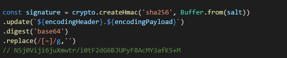 crypto.createHmac('alg방식', 소금).update(암호화할'header.payload').digest('인코딩방식').replace(=없애주기)